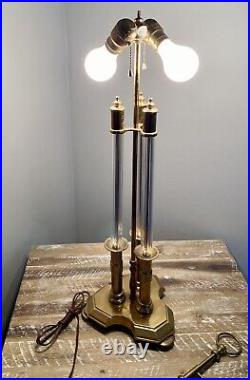 Vintage Brass Colored Table Lamp Lantern Style Light 2 Bulbs Etched Design Decor
