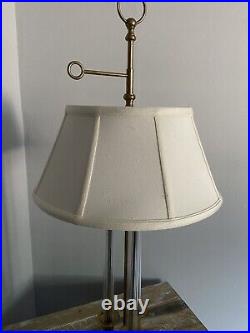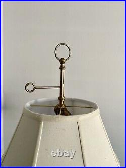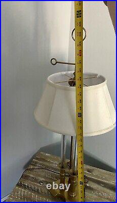 Gorgeous Vintage Brass Table Lamp, Triple Candlestick, 2 Bulbs With Ivory Shade. Works great, brown plug in cord over 70 and 2 pull chains for on/off for each bulb. In very nice condition, needs cleaning and polishing, please see photos for details and measurements. Please note that the lightbulbs are NOT included.