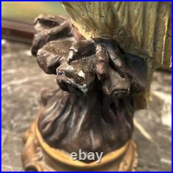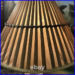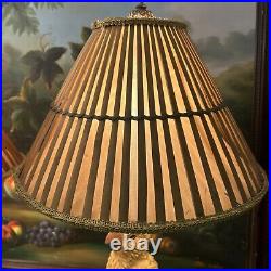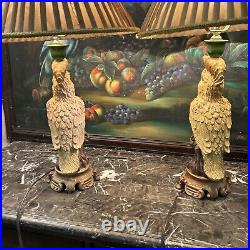 Beautifully aged set of vintage bird lamps. Rare to find a set of two of these guys and very hard for me to part with!! They have moderate wear throughout, no repairs noted. Light rubbing away of the paint adds to their old French Country charm. The lampshades are made of wood with a satin interior. The lampshades could use a little TLC do to needing a light cleaning. This could be a very intricate job and these pieces have not been deep cleaned, but are in beautiful condition. Each lamp stands approximately 24 inches tall.