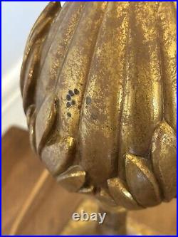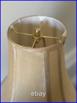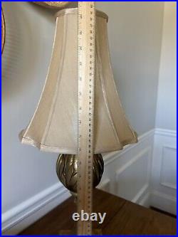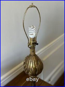 Lamp is in excellent used condition. There are some spots on one side of the lamp shown in the photos. This is part of the lamps design. The shade has some very minor signs of wear but is still in great condition. It does not come with the bulb. This vintage table lamp features a beautiful gold leaf bud design, perfect for adding a touch of elegance to any room. The shade provides a warm, inviting glow, making it a great addition to your collection or as a statement piece. The lamp is corded electric and made of sturdy metal materials, ensuring long-lasting durability. Ideal for collectors of unique and beautiful lamps, this piece is sure to impress.