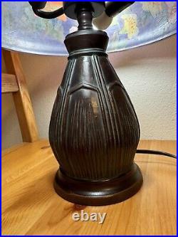 Vintage Glass Flower shade with Cast Metal Table Lamp Desk Lamp 15 Tall. This Lamp is so beautifully made, an eye-catching piece. The craftsmanship is amazing. This lamp is so stunning, rustic but yet so elegant. Any room would look wonderful with its presence. This lamp is in great condition and working, some tiny wear on the lily pad, please see photo for reference. Thanks for looking and shopping with us.