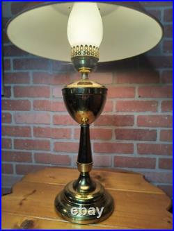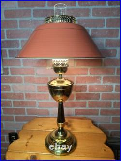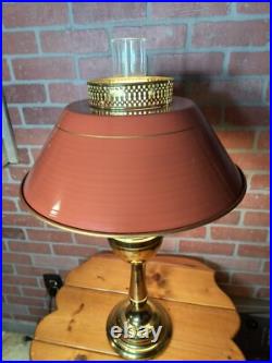 This vintage brass 2-light table lamp with a white metal shade is a unique piece from the 1950s. The maroon and brass color scheme, along with the folk design, adds charm to any room. This tole lamp features a solid color pattern, corded electric power source, and a pull chain control style for easy operation. The 18-inch height and 4.5-inch shade make it a medium-sized piece that will stand out in any collection.